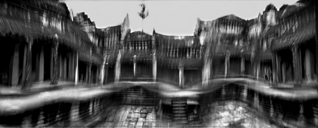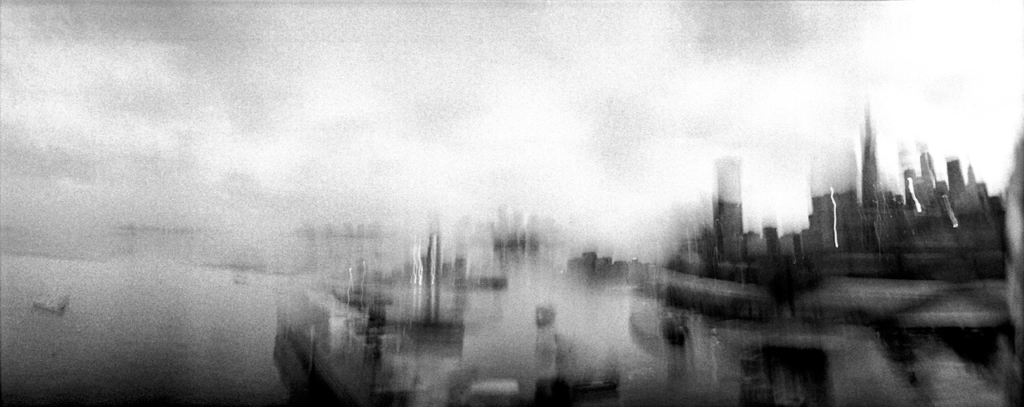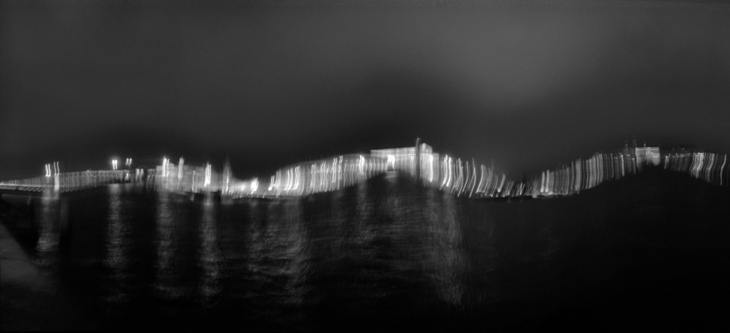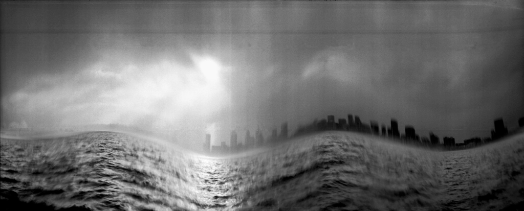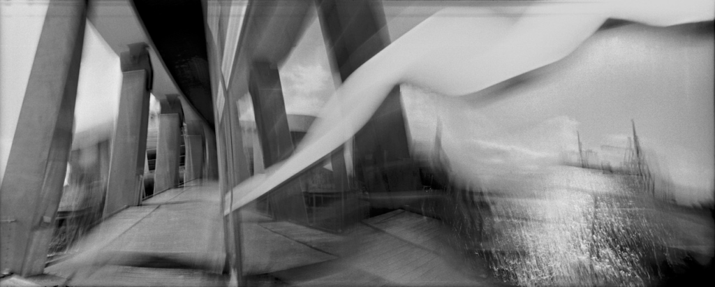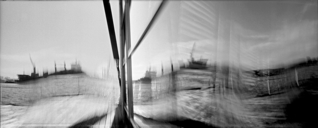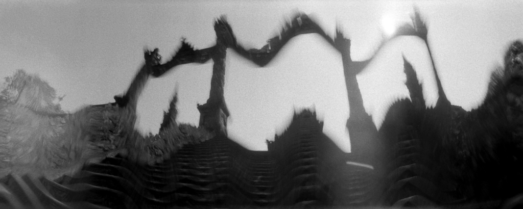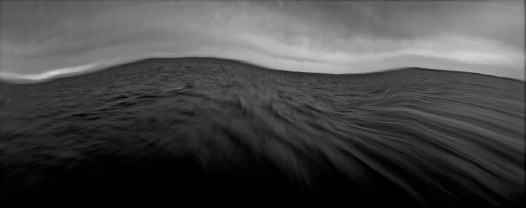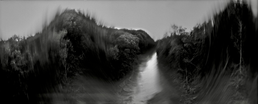 Some years ago with these thoughts in mind I approached landscape with a Russian made panoramic camera. This camera that I chose to use was not technically able to make realistic images due to the moving lens, the bad distortions produced by the optic as well as the awkward construction. Dismissing then the aim to capture reality I decided to push in just the opposite direction, focusing on these main camera faults. By doing so I discovered that while shooting and moving the camera lens in various ways I could add a new layer to the landscapes. Depending on the film used, light exposures, the grain and the shake of the camera I transformed the images. Undulations, cracked lines, confusing textures, ghost like shapes and technical accidents became intentionally part of my images. Impossible landscapes were channeled through the camera lens.